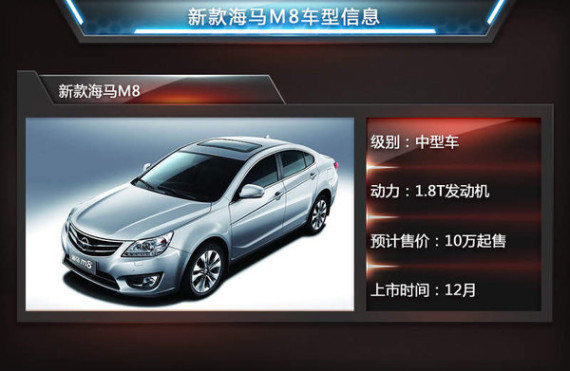 海南一汽海马汽车销售有限公司总经理李伟胜在接受网通社的采访时表示,进入2.0时代后,海马汽车将向 消费者展示新平台、新产品、新技术。普及涡轮增压引擎就是海马汽车近两年的重点之一。李伟胜透露:海马旗下旗舰轿车M8本月将推出搭载1.8T引擎的车型。该发动机最大功率为138kW,与之匹配的是一台6速手自一体变速器。外观方面1.8T车型基本与现款车型基本一致。