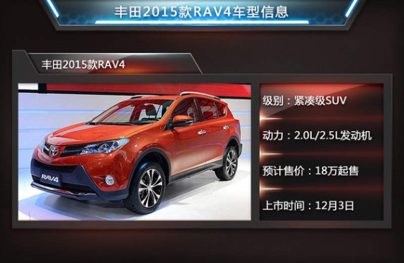丰田经典SUV——RAV4本月将推出改款车型。作为年度改款车型,新车外观和内饰并无较大改动,主要对配置进行了一系列调整。据悉,新车部分车型上的多媒体显示中控屏将由6.1寸升级为7寸。 相比现款车型,新车还增加了珍珠白车身颜色,顶配车型还新增了倒车防碰撞等配置。动力系统方面,新款RAV4并无变化,依然将搭2.0L和2.5L自然吸气发动机,与发动机匹配的是6速手动、6速手自一体以及CVT变速箱。