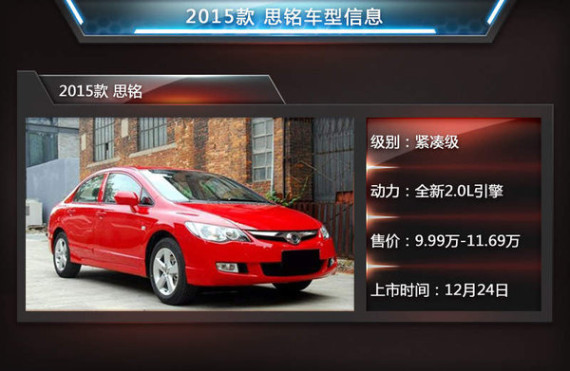 2015款思铭近日公布售价,新车共有三款车型,售价区间为9.99万-11.69万元,将于12月24日正式上市。2015款思铭在外观与内饰上与现款车型并无较大变动,车身尺寸有所提升。新车长宽高为4545/1755/1450mm,长度增加了45mm。 新车将标配主副驾驶安全气囊、ABS+EBD、四向调节方向盘、儿童安全座椅挂钩以及USB接口等配置。顶配车型还将配备16英寸合金轮圈、倒车雷达、真皮座椅、等配置。