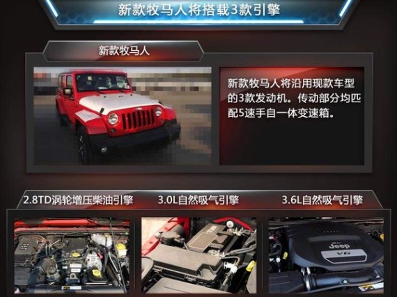动力方面,2015款牧马人将沿用现款车型搭载的2.8T柴油发动机和3.0L和3.6L两款汽油发动机。其中2.8TD涡轮增压柴油发动机,最大功率147kW,2000rpm即可达到峰值扭矩460N·m。3.6L发动机最大功率147kW,峰值扭矩347N·m。与发动机匹配的均为5速手自一体变速箱。作为公认的终极“四驱利器”牧马人依旧是同级无对手,高处不胜寒。