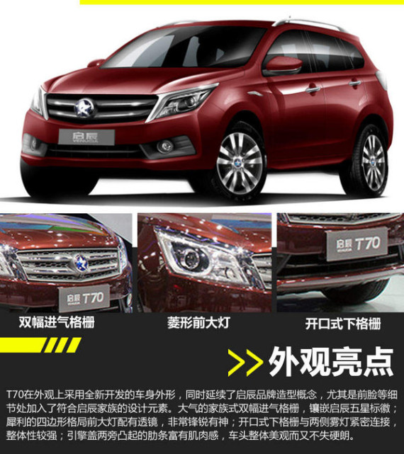 T70在外观上采用全新开发的车身外形,同时延续了启辰品牌造型概念,尤其是前脸和车尾等细节处更是加入了符合启辰家族的设计元素。大气的家族式双幅进气格栅,镶嵌启辰五星标徽;犀利的四边形格局前大灯配有透镜,非常锋锐有神;开口式下格栅与两侧雾灯紧密连接,整体性较强;引擎盖两旁凸起的肋条富有肌肉感,车头整体美观而又不失硬朗。