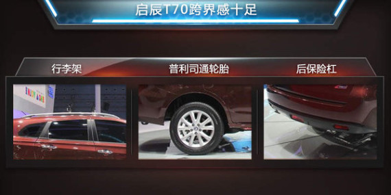 从整体来看,启辰T70是一款偏向硬朗气质的车型。侧身腰线较高,显得更加大气;启辰SUV的车尾流线较为倾斜,尾灯设计的位置也较高;车顶标配的行李架与车尾不同色的后保险杠设计,与其说它是一台城市SUV不如说它的整体质感更像是一款跨界车型。同时采用的普利司通DUELER H/P SPORT(动力侠)轮胎也体现了T70的越野功能,能应付各种路况需求。