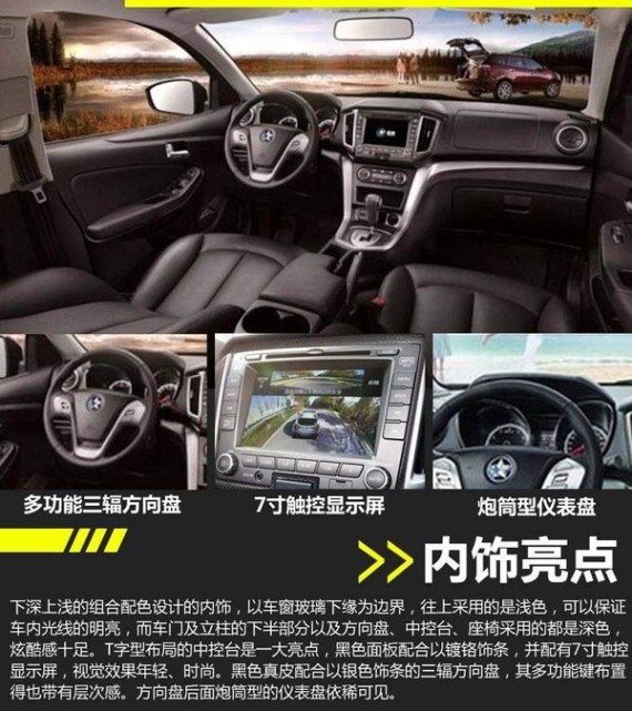 下深上浅的组合配色设计的内饰,以车窗玻璃下缘为边界,往上采用的是浅色,可以保证车内光线的明亮,而车门及立柱的下半部分以及方向盘、中控台、座椅采用的都是深色,炫酷感十足。T字型布局的中控台是一大亮点,黑色面板配合以镀铬饰条,并配有7寸触控显示屏,视觉效果年轻、时尚。黑色真皮配合以银色饰条的三辐方向盘,其多功能键布置得也带有层次感。方向盘后面炮筒型的仪表盘依稀可见。