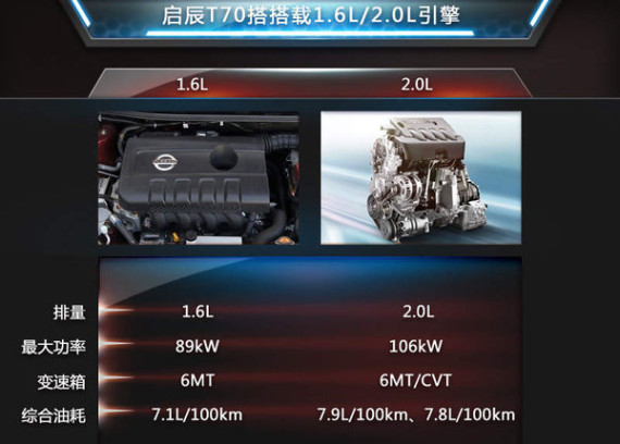 启辰T70将配备一款1.6L和2.0L自然吸气发动机,型号分别为HR16DE和MR20DE,前者额定功率89kW,2.0L发动机为106kW。与1.6L发动机匹配的是5速手动变速箱,2.0L发动机搭配的除了6速手动外,还有日产 CVT变速箱,从工信部的综合油耗数据看,CVT变速器的燃油经济性更佳,百公里综合耗油仅为7.8L。