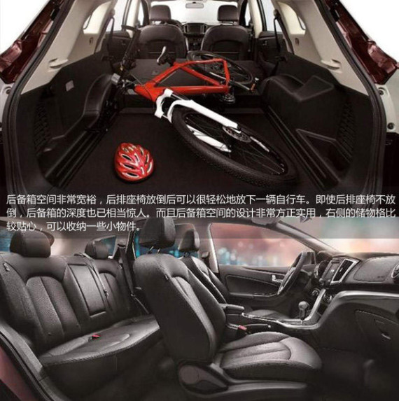 启辰T70长宽高分别为4542/1786/1642mm,车身尺寸介于紧凑级与中型SUV之间。值得一提的是,从C柱之后的长度来看,后备箱空间非常宽裕,如官方图所示,后排座椅放倒后可以很轻松地放下一辆自行车。即使后排座椅不放倒,后备箱的深度也已相当惊人。而且后备箱空间的设计非常方正实用,右侧的储物格比较贴心,可以收纳一些小物件。