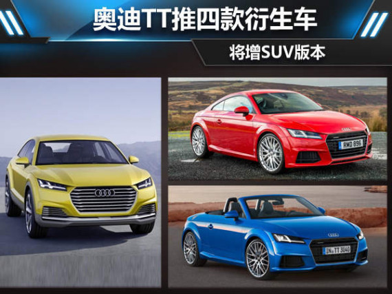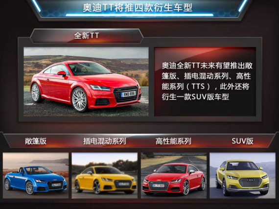 TT系列作为目前奥迪的入门跑车产品,较小的身材以及灵活的操控使其拥有很高的知名度,而随着全新一代产品的推出,多种新技术的搭载使新车型得到了大幅度提升。同时目前除TT普通版车型外,TT S(性能版)和TT Roadster(敞篷版)等衍生车型,未来还有望推出TT offroad concept的量产SUV以及插电混动版本。