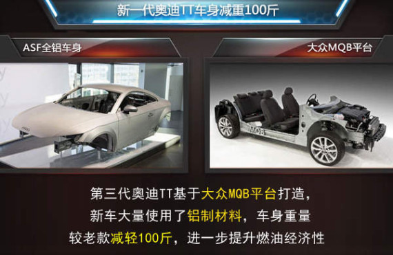 全新TT作为基于大众MQB平台打造的产品,旗下多款衍生产品也有望应用这一平台技术进行打造。由于全新一代TT车型大量使用了铝制材料等轻量化技术,其在车身重量上较老款轻了100斤,进一步提升了新车的操控性和燃油经济性。
