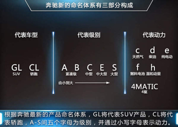 另外由于奔驰此前正式公布了全新的命名体系,旗下所有车系均将由1-3个大写字母组成,并将围绕着目前轿车产品序列中的A级、B级、C级、E级和S级,在一定程度保留原始命名的同时,以字母组合的形式体现不同级别的产品。而因采用特殊的动力系统,所以新能源车型也有特殊的尾缀标识,插电混动和纯电动车型则加入字母“e”,HYBRID混动车型则加入字母“h”。