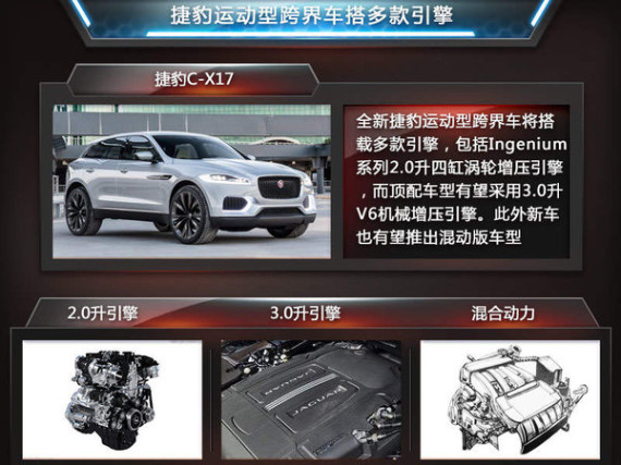 动力方面,全新捷豹运动型跨界车将搭载多款引擎,包括Ingenium系列2.0升四缸涡轮增压汽油发动机,该发动机分为高低两种调校版本,而顶配车型有望采用3.0升 V6机械增压引擎。此外,未来新车也有望推出混动版车型,其动力源或来自捷豹路虎联合供应商、大学和英国政府技术战略委员会等12家斥资约1.55亿人民币的巨资研发“Evoque-e”新能源技术项目。传动方面,新车将标配8速自动变速箱,同时也将提供6速手动变速箱。