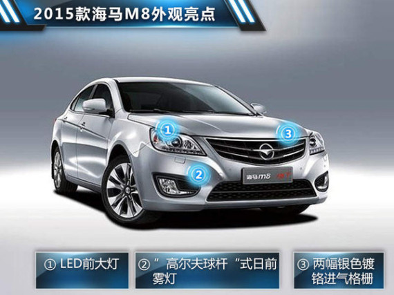 外观造型方面,2015款海马M8基本保持了现款车型的整体设计风格,变动则主要集中于对细节处的把控。极富辨识力的车前大灯与两幅银色镀铬进气格栅很好地融为一体,而在高尔夫球杆形状的前雾灯处还首次将LED日间行车灯纳入其中。