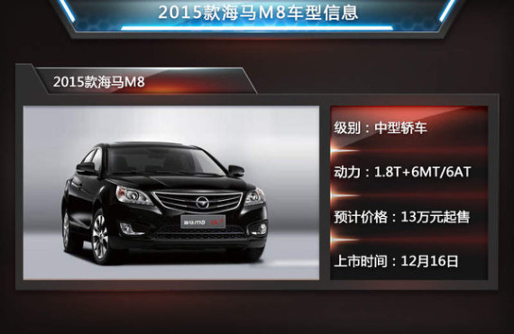 前不久,海马汽车发布了海马S5 1.5T车型,而这款车也是海马旗下首款搭载涡轮增压技术的产品。海马汽车销售公司副总经理刘海权此前在接受媒体采访时表示:“海马S5 1.5T车型正式启动了海马汽车的‘T’时代。”,而这样的说法即将变成现实。日前,海马汽车官方透露:2015款海马M8将于今日正式上市,届时将会推出4款车型,该车最大的亮点在于使用了由海马自主研发的1.8T发动机。此外,根据现款2.0L的车型定价,我们预计这款技术含量更高的产品起售价格将在13万元上下。