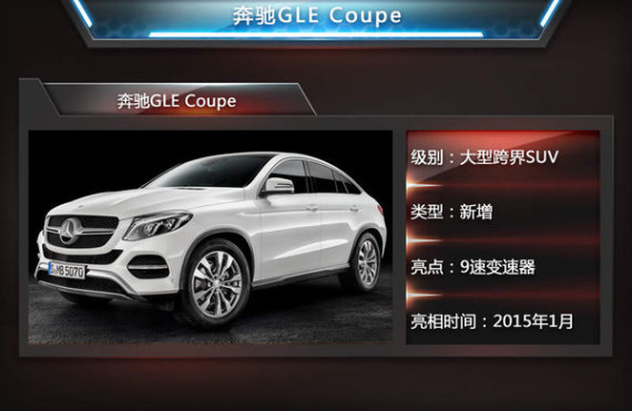 奔驰GLE Coupe采用了轿跑风格,将Coupe造型与SUV两种设计元素结合在,动感时尚的外观以及车顶流线设计,突出了其跨界SUV身份。GLE Coupe将在美国阿拉巴马州的奔驰工厂进行生产,预计2015年1月发布,随后可能在年底正式上市。未来目标将会锁定为宝马X6,新款X6售价在93.8-189.9万元,而奔驰全新的GLE Coupe车型上市后将与其展开激烈竞争。