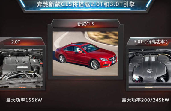 奔驰新款CLS预计将在2015年上半年正式推出,并将推出CLS 260、CLS 320以及CLS 400等多款车型,其中CLS 400有望与现款CLS 350售价基本持平,CLS入门级车型在更换小排量引擎后售价有望大幅下调。动力方面,新款CLS将不再使用现款3.5L发动机,取而代之将是更小排量的引擎,保证动力的同时进一步提升燃油经济性。其中新的入门车型CLS 260预计将搭载一款2.0T发动机,最大功率155kW;而CLS 320和CLS 400 4MATIC车型,有望搭载与现款S级相同的3.0T双涡轮增压发动机,并分为高低功率两个版本,最大功率200kW和245kW,峰值扭矩400Nm和480Nm。