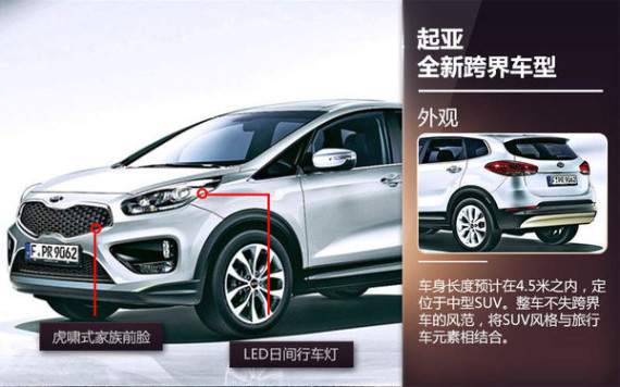 这款代号为DE的全新混合动力跨界车型将是起亚跨界车市场的首位领导者。据海外媒体报道,其车身长度预计在4.5米之内,定位于中型SUV。从效果图可以看出,整车不失跨界车的风范,将SUV风格与旅行车元素相结合。新车在外观方面与全新索兰托相似,采用了起亚最新的虎啸式家族前脸,依然保持圆润且不规则形状的进气格栅。前大灯有望采用双透镜灯组及氙气近光灯配置,或加入LED日间行车灯。