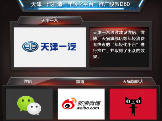 自此之后,天津一汽还通过建设微信、微博、天猫旗舰店等年轻消费者热衷的“年轻化平台”进行推广,并取得了出众的效果。据统计,天津一汽微信平台粉丝订阅量已经超过20万,全系微博平台粉丝已经超过150万;除此之外,在天猫旗舰店销售的产品亦突破千台大关。