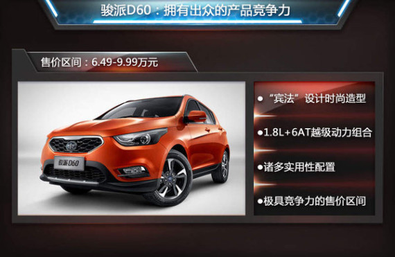 在产品层面,骏派D60更是天津一汽历时近5年时间打造的小型SUV,聘请国际设计公司“宾尼法利纳”操刀。为骏派品牌树立了家族式的设计语言,通过动感时尚的造型设计,令众多80后消费者为之动心。丰田1.8L发动机+6AT的动力组合、匹配车内无钥匙启动、电动天窗、真皮座椅、真皮方向盘等诸多实用性配置,令这款不足10万元的小型SUV显得极具竞争力。