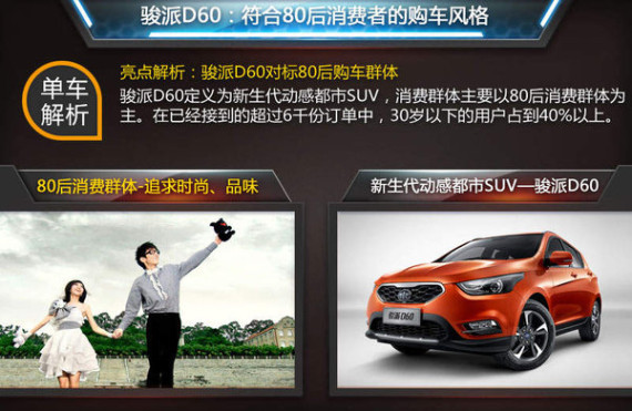 D60作为骏派品牌的首款车型,肩负着“骏派”缔造品牌形象的重任。按照天津一汽官方的定位:骏派品牌将主打时尚和经济型高端市场,D60上市平均售价在8万元左右,突破了以往天津一汽只能生产微车的企业形象,形成多品类经济型高、中、低产品布局;骏派D60更是定义为新生代动感都市SUV,消费群体将主要以80后消费群体为主。在已经接到的超过6千份订单中,30岁以下的用户占到40%以上。