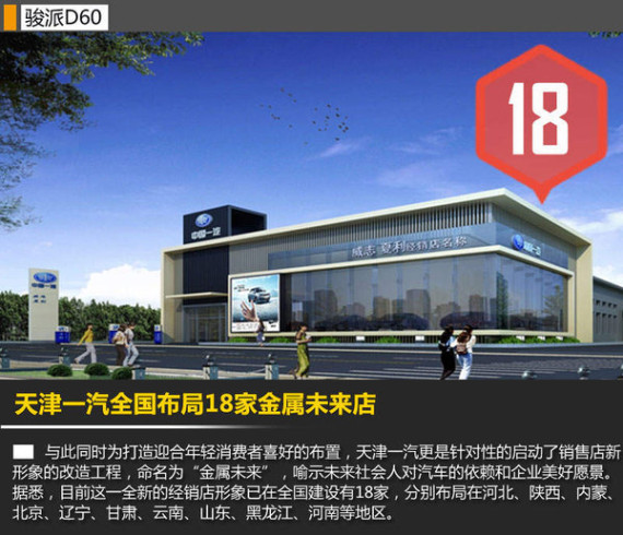 与此同时为打造迎合年轻消费者喜好的布置,天津一汽更是针对性的启动了销售店新形象的改造工程,并命名为“金属未来”,喻示未来社会人对汽车的依赖和企业美好愿景。据悉,目前这一全新的经销店形象已在全国建设有18家,分别布局在河北、陕西、内蒙、北京、辽宁、甘肃、云南、山东、黑龙江、河南等地区。
