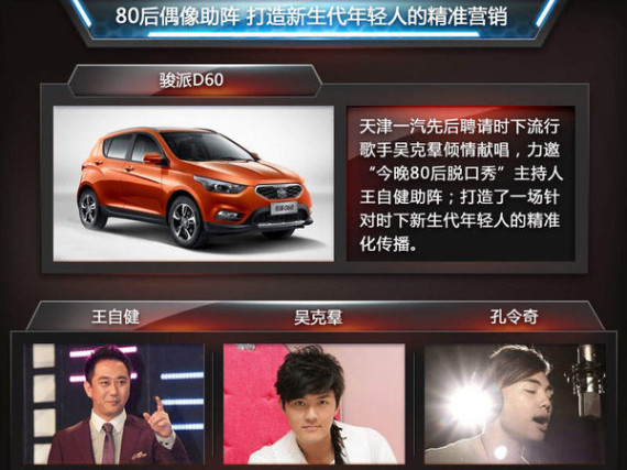不到2个月的时间骏派D60能够取得超过6000张订单的成绩,除了产品本身的优势外,更取决于天津一汽极具针对性的年轻化传播。据了解,自骏派D60上市发布会开始,天津一汽先后聘请时下流行歌手吴克羣倾情献唱,力邀“今晚80后脱口秀”主持人王自健登台,打造了一场针对时下新生代年轻人的精准化传播。