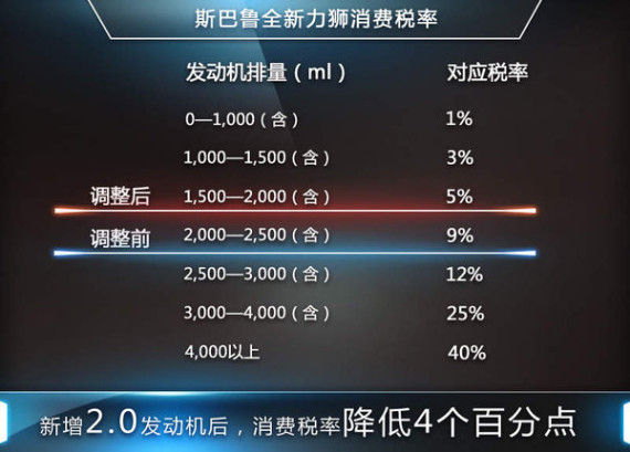 按照斯巴鲁现款力狮搭载的2.5L来计算,其消费税税率达到9%,未来如果搭载2.0T引擎,其消费税税率相对2.5L车型将下调4个百分点,对于车企来说,这意味着成本将得到有效缩减。未来该车引入后,其售价或将更加“接地气”,对于消费者而言,显然是一个不错的信息。
