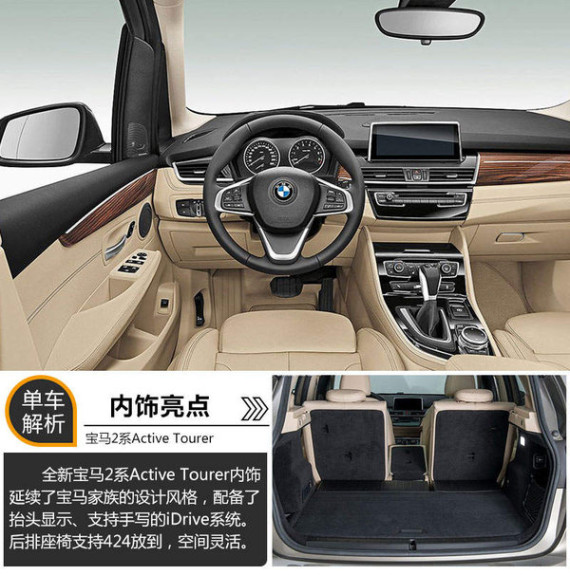 内饰方面,2系Active Tourer的米黄色的配色更为持家,仪表盘与多功能方向盘十分动感,仪表盘上方配备有抬头显示提升了驾驶安全。中控台层次分明,大尺寸的显示屏很有显档次。该车并没有使用宝马电子档杆而是普通档杆,档杆旁加大尺寸的iDrive控制旋钮带有手写板的功能。前排桌椅的大腿支撑设计很人性化,给予长途驾驶更好的舒适性。此外,后排座椅支持424放倒,空间设计十分灵活。