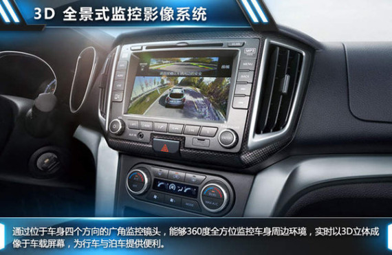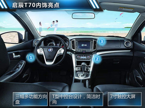 启辰T70内饰完全颠覆了启辰此前推出几款轿车的设计风格。下深上浅的组合配色,搭配大面积镀铬条的T字型中控台是一大亮点,与外观年轻时尚的风格呼应,多功能三辐方向盘也镶入镀铬条层次分明。既然定位为“技术派智享SUV”,在配置上启辰T70自然也有几分底气。虽然是一款10万元区间的SUV,启辰T70却搭载了3D 全景式监控影像系统等高科技技术。搭载3D AVM功能的启辰T70基于车身上的四个摄像头采集到的图像,经过后台合成处理,可以呈现3D效果图。