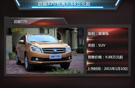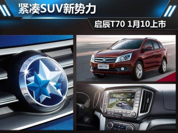 如今SUV市场高烧不退,据不完全统计,仅今年一年时间就已经有十多款全新SUV相继上市。在今年的广州车展上,车市新军东风日产启辰也正式发布了旗下首款SUV ——启辰T70。近日,启辰内部人士透露:启辰T70将于2015年1月10日正式上市。