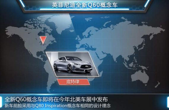 英菲尼迪在去年巴黎车展中正式发布了期间跑车-Q80 Inspiration,该车的外观设计由于采用较为前卫的设计风格令人印象深刻,需要指出的是,英菲尼迪入门级跑车-全新Q60也将采用与之类似的设计理念。对此,英菲尼迪执行设计总监阿方索(Alfonso Albaisa)表示:“如果说Q80 Inspiration揭示了英菲尼迪的未来设计语言,那么Q60概念车则在发展的道路上迈开了新的一步。”近日,英菲尼迪官方透露:英菲尼迪全新Q60概念车将在本月中旬开幕的北美车展中发布。在动力方面,新车将有望采用与Q50相同的2.0T涡轮增压引擎。