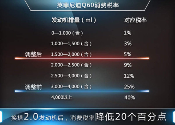从成本的角度来看,按照英菲尼迪现款Q60搭载的3.7L来计算,其消费税税率高达25%,未来如果搭载2.0T引擎,其消费税税率相对3.7L车型将下调20个百分点,对于车企来说,这意味着成本将得到有效缩减。未来该车引入后,其售价或将更加“接地气”,对于消费者而言,显然是一个不错的信息。