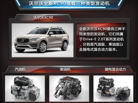 动力方面,沃尔沃XC90相比老款向前跨越了一大步,采用了沃尔沃全新Drive-E系列四缸发动机。所有发动机的排量均被限定在2.0升,其中汽油版本T5车型搭载2.5升涡轮增压引擎,最大功率189kw,峰值扭矩350N.m;T6车型搭载2.0升(涡轮增压+机械增压),最大功率239kw,峰值扭矩400N.m;柴油版本D4车型可爆发出142kw,峰值扭矩400N.m,而双增压版最大功率168kw,峰值扭矩则高达470。最高版本的T8车型采用了2.0升双增压(涡轮增压+机械增压)+电动机的动力布局,总输出功率298kw,峰值扭矩高达640N.m,纯电动模式下可续航40公里。