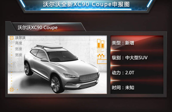 在本次申报图中我们发现了沃尔沃XC Coupe的身影,这款车是沃尔沃在去年北美车展上发布的全新概念车,设计风格预示着未来XC系列SUV的设计方向。在今年下半年推出全新XC90,具有很明显的XC Coupe概念车的影子,例如更具运动风格的“X”前脸设计,直瀑式中网以及新一代车型最具特色的“T”型前大灯。在跨界风流行的当下,不排除沃尔沃未来有可能基于XC Coupe推出跨界版车型。
