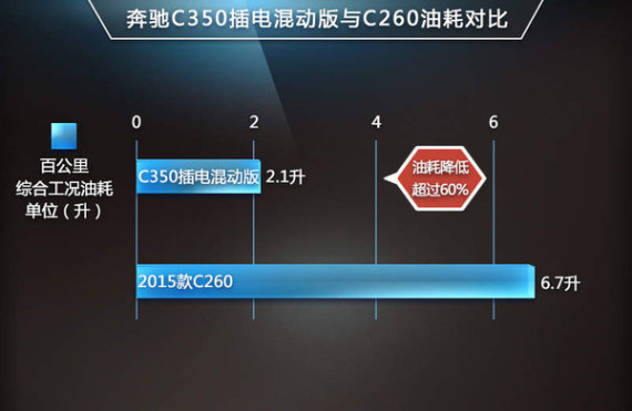 根据上述动力数据的对比不难看出,C350插电混动车型与仅搭载传统涡轮增压内燃机的2015款C260相比,在动力上的提升十分明显。那么,这款新能源车在油耗方面的表现又如何呢?根据奔驰官方给出的数据,在混合动力模式下奔驰C350混合动力车型的每百公里油耗仅为2.1L。同样拿2015款奔驰C260进行比较,新车的油耗比C260降低了超过60%。高效的燃油经济性和出色的动力表现,将让奔驰C350插电混动车型在豪华混合动力轿车市场拥有很强的竞争力。