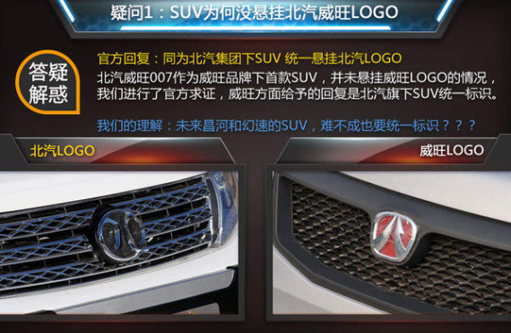 首次见到一款陌生的新车时候,我们总是会有很多疑问。见到北汽威旺007的时候,我的第一个问题也是油然而生。值得关注的是,这款SUV并未悬挂威旺LOGO标识,而是悬挂北汽集团的LOGO。对于这一情况,网通社询问了北汽威旺的官方人士进行了解读,并给予的回复:“北汽集团旗下自主品牌的SUV都会悬挂北汽LOGO,这不足为奇。”