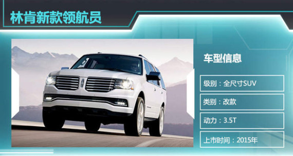 林肯新款领航员定位全尺寸旗舰SUV,与凯迪拉克凯雷德、奔驰GL同级别车型。新款领航员于去年9月在美国市场上市,62,475美元(约合人民币38.3万元)起售。随着林肯加速扩充国内市场产品线,新款领航员将以进口的方式于今年登录国内市场。从此前曝光的国内申报图来看,新款领航员国内版车型外观设计将与海外版车型基本保持一致。