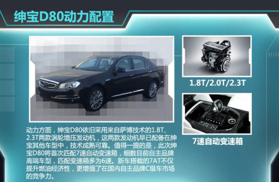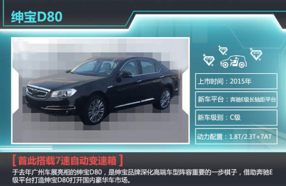 于去年广州车展亮相的绅宝D80,是绅宝品牌深化高端车型阵容重要的一步棋子,借助奔驰E级平台打造绅宝D80打开国内豪华车市场。按照企业规划,新车定位于C级轿车,车身长度超5米,轴距超3米,搭载1.8T、2.0T、2.3T三款不同发动机,值得一提的,新车将首次搭载7速自动变速箱。