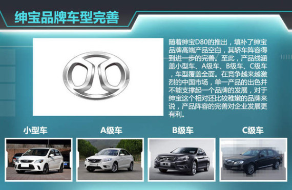 随着绅宝D80的推出,填补了绅宝品牌高端产品空白,其轿车阵容得到进一步的完善。至此,产品线涵盖小型车、A级车、B级车、C级车,车型覆盖全面。在竞争越来越激烈的中国市场,单一产品的出色并不能支撑起一个品牌的发展,对于绅宝这个相对还比较稚嫩的品牌来说,产品阵容的完善对企业发展更有利。