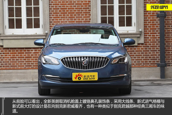 全新英朗的外观设计融汇了别克Riviera II概念车的设计精髓,秉承别克“动感流畅”的设计语言,整体车身造型简约、动感。新车前脸大气饱满,展翼式HID大灯由黑白穿插的形面和三维曲线构成,造型简洁却恰到好处地塑造出深邃的内部空间和悬浮感。大灯向车身两侧延伸,突出横向视觉效果。氙气大灯增加防雾涂层,能有效增强雨、雪、雾霾天气下灯光的照射效果,营造更为安全的驾驶条件。全新英朗同级唯一标配LED日间行车灯,打造安全的行车保护。而经典直瀑式镀铬进气隔栅昂首直立,镀铬工艺利落大方。上部与引擎盖型面完美融合,整体大气均衡。
