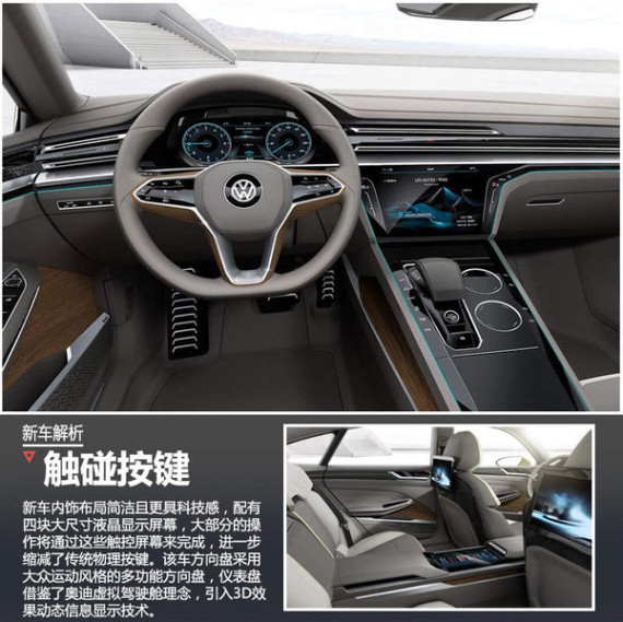 新车内饰布局简洁且更具科技感,配有四块大尺寸液晶显示屏幕,大部分的操作将通过这些触控屏幕来完成,进一步缩减了传统物理按键。该车方向盘采用大众运动风格的多功能方向盘,中控及仪表盘部分借鉴了不少今年CES电子消费上奥迪虚拟驾驶舱技术理念,12.3英寸的仪表盘引入3D效果动态信息显示技术。除此之外,中控台镶嵌有娱乐控制屏幕,前排座椅后部各有一块10.1英寸的屏幕。该车采用四座布局,前后中央扶手部分连为一体,后排扶手处也镶嵌一块控制屏幕(12.3英寸),该控制屏可控制娱乐影音信息、导航信息以及后排娱乐系统屏幕信息。