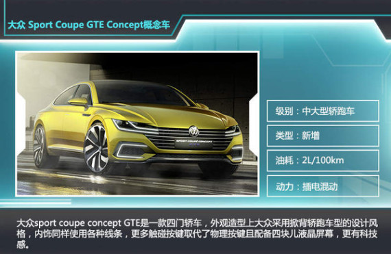 大众sport coupe concept GTE是一款四门轿车,外观造型上大众采用掀背轿跑车型的设计风格,整车线条多变设计大胆,内饰同样使用各种线条,更多触碰按键取代了物理按键且配备四块液晶屏幕,更有科技感。大众品牌发展董事会成员Heinz-Jakob Neusser介绍,“与现有的其他同级车不同,这款概念车在动力性能方面有着惊人的突破,基于运动轿跑的独特设计,辅以丰富的驾驶功能和四座空间,在B级和C级车市场多了一个抢眼的选择。”