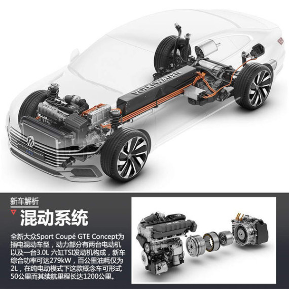 全新大众Sport Coupé GTE Concept为插电混动车型,动力部分由两台电动机以及一台3.0L 六缸TSI发动机构成,这款发动机可输出220kw的最大功率以及500Nm的峰值扭矩。电机系统包括两台电动机以及一块锂电池,其中一台电动机集成在6速DSG变速箱中(代号DQ400E),最大功率40kW;后部电机的最大功率为85kW。新车综合功率可达279kW,百公里油耗仅为2L,在纯电动模式下这款概念车可形式50公里而其续航里程长达1200公里。