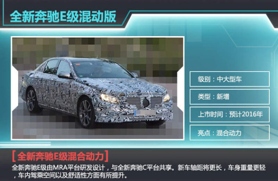 今年宝马率先在华投产了基于5系打造的插电混动车型530Le,奔驰自然不会放过这块细分市场,戴姆勒集团首席执行官蔡澈博士透露:“2016年全新一代奔驰E级即将在中国投产,该系列国产车型中将会新增插电混动车型并同期推出。”新车将基于MRA平台研发,与全新C级共享平台。新车的动力系统由一台最大公里155kW 的2.0T发动机与51kW的电动机构成,匹配7速自动变速箱。全新E级混动车型的百公里油耗仅为2.1L,节油率达79%。此外全新E级还将推出一款V6发动机搭电动机的车型。