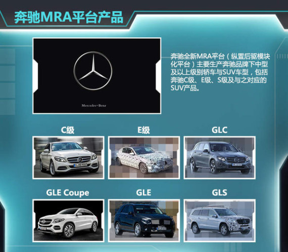 奔驰全新MRA平台(纵置后驱模块化平台)主要生产奔驰品牌下中型及以上轿车、SUV车型,包括奔驰C级、E级、S级及与之对应的SUV产品,本次奔驰计划2017年将插电混动技术覆盖的C级、GLC级、GLE Coupe等车型均出自该平台,模块化平台零件共通化的有点有效降低成本。目前北京奔驰已引进MRA平台生产代号W205的奔驰C级以及代号W212的全新奔驰E级,未来还将国产GLK的换代产品GLE。