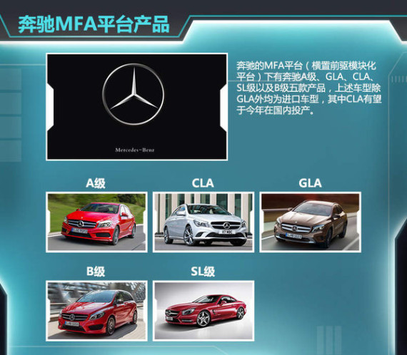 奔驰的MFA平台(横置前驱模块化平台)下有奔驰A级、GLA、CLA以及B级四款产品,上述车型除GLA外均为进口车型,其中CLA将于今年在国内投产。2014年中国MPV销量激增,同比攀升43.5%甚至高于SUV的37.1%,家用MPV将凭借其实用性有望成为另一个增长点,宝马顺应此趋势推出国产2系7座MPV,奔驰也有望将B级在国内投产与之竞争。