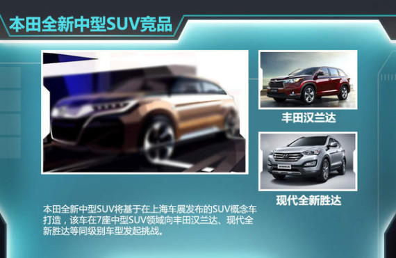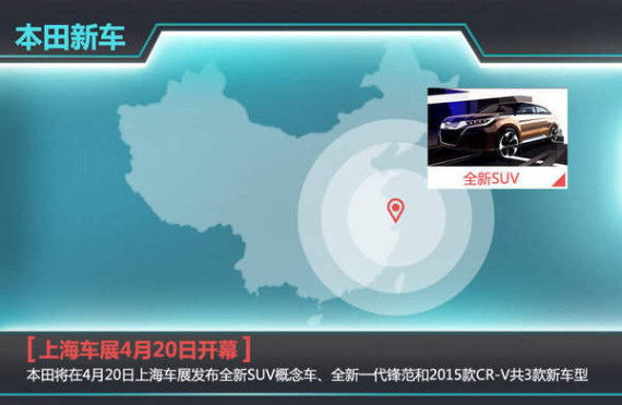 鉴于2015年整个汽车市场增速预期将有所放缓,本田新车投放力度也将进行相应调整。中国作为本田全球范围内最重要的市场之一,每每在新产品投放之前,本田考虑得更多的是满足国内消费者的需求。根据本田(中国)官方规划到:本田全新SUV概念车、全新一代锋范以及2015款CR-V均将在4月20日开幕的上海车展中发布,其中全球首发的全新SUV专为中国市场打造,而两款7座中型SUV将有望基于这款全新概念车打造而来。