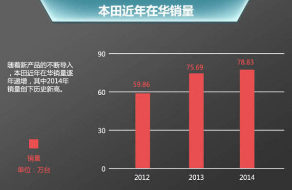 在整个汽车市场整体放缓的大背景下,本田在华销量却在逆势增长,2013年销量为75.69万辆,同比大幅增长26%,2014年销量则达到78.83万辆,同比增长4.1%,创下在华销量历史新高。不得不提到的是,随着一系列新技术以及新车型的陆续推出,本田未来有望继续保持增长。