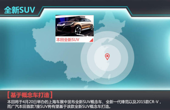 中国是本田在全球范围内最重要的市场之一,因此本田对于即将开幕的上海车展非常重视,包括全新SUV概念车、全新一代锋范以及2015款CR-V等重量级车型都将在上海车展正式亮相。其中全新SUV概念车专为中国市场打造,那么广汽本田首款7座SUV极有可能是基于这款全新概念车打造。