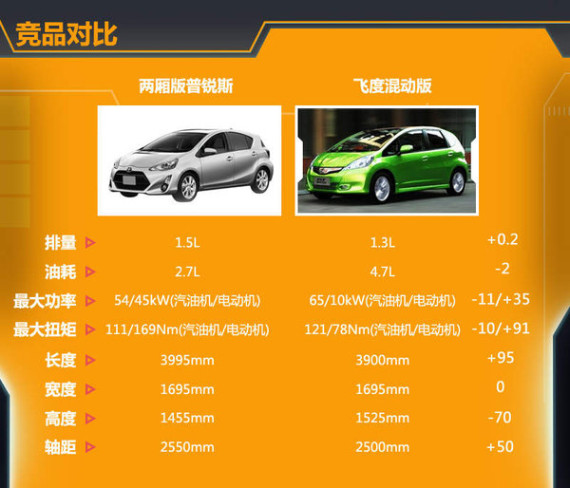 两厢版普锐斯引入国内后,将会和广汽本田飞度混动版展开正面竞争,由于暂时没有两厢版普锐斯在国内推出后的动力以及车身尺寸方面的信息,那么只能用海外版两厢普锐斯的数据与飞度混动版进行对比。通过对比我们发现,两厢版普锐斯油耗比飞度混动版低2L,每百公里只需要消耗2.7L燃油,这一数据表现确实非常出色,值得一提的是,两厢版普锐斯的车身尺寸也比较有优势。