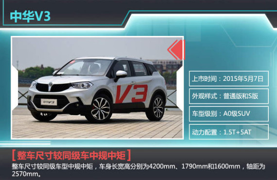 中华V3是一款面向年轻消费者而开发的SUV,其上市后主攻85后年轻群体。该车定位小型SUV,基于华晨自主研发的前驱模块化平台打造,新车推出普通版和S版两种不同的外观样式。整车尺寸较同级车型中规中矩,车身长宽高分别为4200mm、1790mm和1600mm,轴距为2570mm。