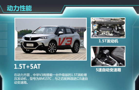 在动力方面,中华V3将搭载一台升级版的1.5T涡轮增压发动机,型号为BM15TC。因为同为1.5T发动机,现款在售的中华V5车型上搭载的发动机型号为BM15TB。不过,两款1.5T发动机最大功率相同为110kW。在联合电子的发动机标定技术、全新前驱模块化平台以及电动助力转向系统的共同驱动下,中华V3性能更显卓越。此外,中华V3还将推出2款纯电动版车型,最大功率为70kW。传动方面,新车将匹配韩国进口的5速自动变速箱。