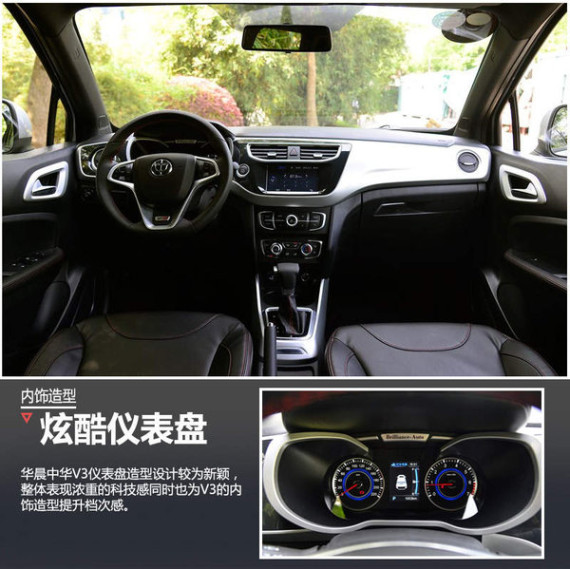 华晨中华V3仪表盘造型设计较为新颖,提升了内饰科技感和档次感;对称式的中控台采用分层布局,选用纯黑色调配银色饰板,中间装备有液晶屏;多功能方向盘的设计在H330的基础上进行了改进采用三幅样式,增添了镀铬装饰;空调出风口的镀铬装饰与下方功能按键控制区域装饰相呼应,整体设计偏向年轻风格。配置方面,高配车型将额外配备天窗、倒车雷达、侧气囊以及四轮盘式制动等。